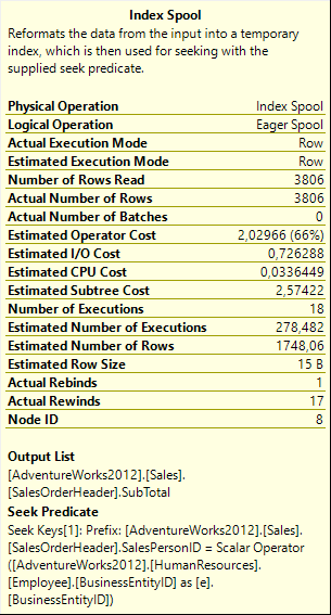 The above explanation doesn’t mention Index Spool #8. The most common cause for Index Spool operators in a plan is when SQL Server wants an index really bad. The SalesOrderHeader table does have an index on the SalesPersonID column but it is not covering for this query, so the optimizer was faced with the choice between either using that index and accepting the cost of a lookup, or using a scan … and then it decided to go for door number three, the Index Spool that basically builds the index on the spot and throws it away when the query is done.