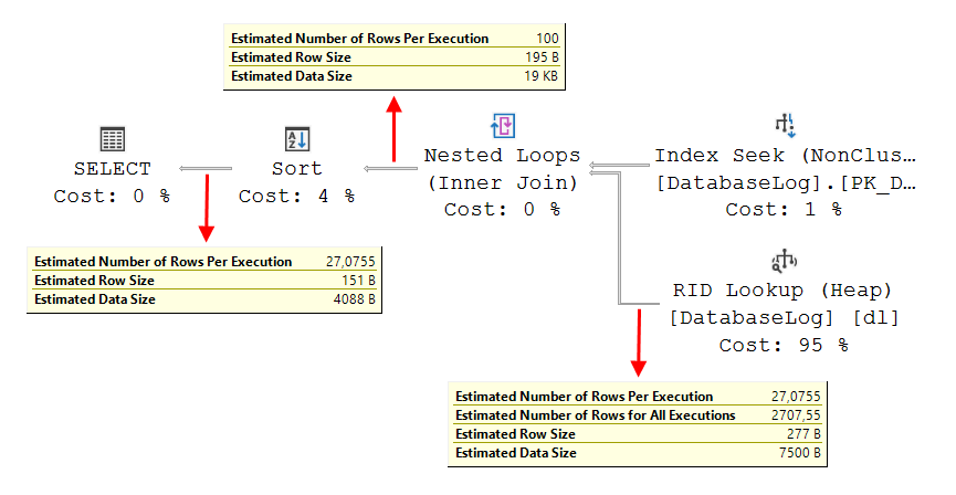 The DatabaseLog table has no clustered index, so it is a heap. It does have a nonclustered index on the DatabaseLogID column, and no other indexes. So for this query, the optimizer has limited options. It can use an Index Seek operator to find all rows with DatabaseLogID <= 100, fetch the additional columns with a RID Lookup, then use a Filter operator to retain only the rows with Event = ‘ALTER_TABLE’. Or it can use a Table Scan operator, with both filters pushed down in its Predicate property, to return only the required rows (at the price of reading all of them). For a higher cut-off point in the DatabaseLogID filter, it would use that second option. But for the query as shown, the Index Seek + RID Lookup is estimated to be cheaper. So this is the execution plan that is produced for this query: