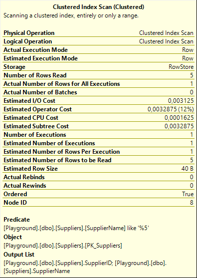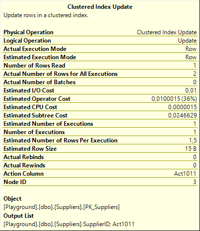 The Clustered Index Scan simply finds and returns the rows that match the WHERE clause and hence need to be updated. It does come with one small surprise: its Output List property includes the SupplierName column. Based on the query, that appears to be superfluous. The SuplierName is not used in the query, and there are also no constraints or other hidden functionality that warrants fetching this column. The reason why this column is read anyway will become clear later.