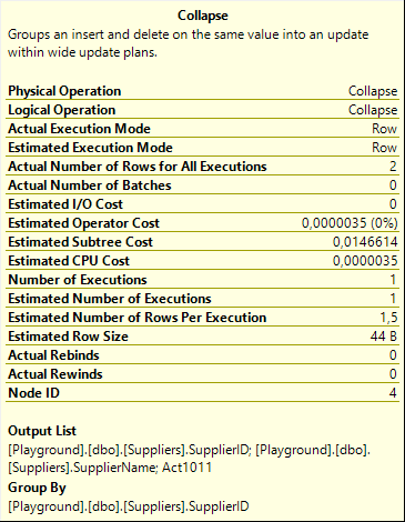 The Collapse operator then reads this sorted input, looking for combinations of a delete and an insert for the same Group By column, SupplierID in this case. It combines these combinations into one new output row, with Action Column Act1011 set to 1 (update). Instead of deleting a row with that SupplierID and SupplierName X and then inserting a new row with the same SupplierID and SupplierName Y, the two changes are collapsed into a single update to change the SupplierName from X to Y for that SupplierID. This is a very different update from what the query asked for, but the final result is the same, and that’s what counts. And because this action requires the SuplierName to be known, we now understand why this column was returned by the Clustered Index Scan.