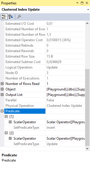 In the full properties list of the Clustered Index Update, you see that the Predicate property is a bit more complex as well. The screenshot to the right shows that it is actually a set of two scalar operators, each with their own SetPredicateType. Not visible in the screenshot (for obvious reasons when you follow along with the code on your own system) is the content of these two scalar operators.
