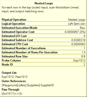 Only when a SupplierID value was actually deleted from the table, the foreign key might be violated. So in that case, and in that case only, the Index Seek does get called to check if there are any referencing rows. And because the Nested Loops runs as a probed Left Semi Join, it stops immediately after finding the first matching row, or after searching and finding no matching rows. The result of this existence check gets passed to the parent operator in the Probe Column: Expr1012.