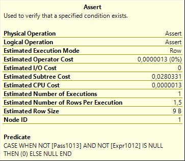 Finally, the Assert operator uses both the Pass1023 column (to know whether the foreign key was checked at all) and the Expr1012 column (the result of that foreign key check) to stop execution, rollback the transaction and throw an error if something in the statement caused the foreign key constraint to be violated.