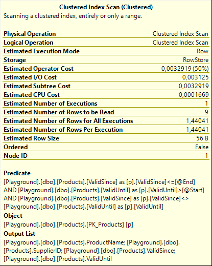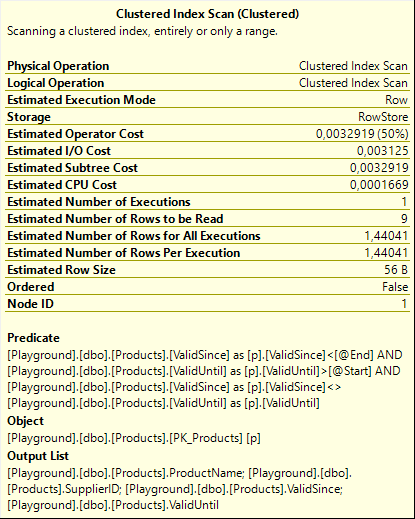 Exactly. And for that reason, the operators that read data from the current and history tables (most likely scans if there is no additional WHERE clause in the query) still have a single filter left in their Predicate property: “ValidSince <> ValidUntil”.