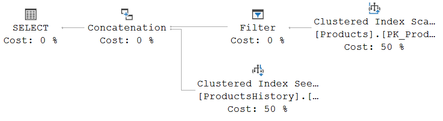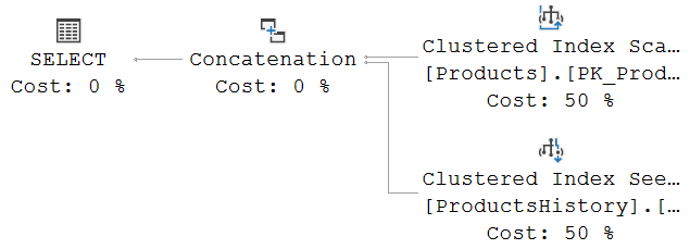 If you compare this to the execution plan that was used for the AS OF query in the previous post, you will see that the same basic pattern is used of reading the current table and the history table separately, then combining the results in a Concatenation operator. In this case, both tables are read with a Clustered Index Scan, which is of course the result of the optimizer looking at the filters used, the available indexes, and the estimated data distribution. Please see my previous post in this series for a longer discussion of the steps taken by the optimizer to come up with an execution plan and the options we have available in the form of indexing to give the optimizer better choices.