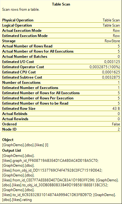This execution plan looks remarkably similar to the execution plan we previously saw when we queried a node table. The only clearly visible difference is that this time, we get a Table Scan, rather than a Clustered Index Scan. That is because we declared a primary key (which by default creates a clustered index) when creating the Person table, and did not do so when we created the likes table.