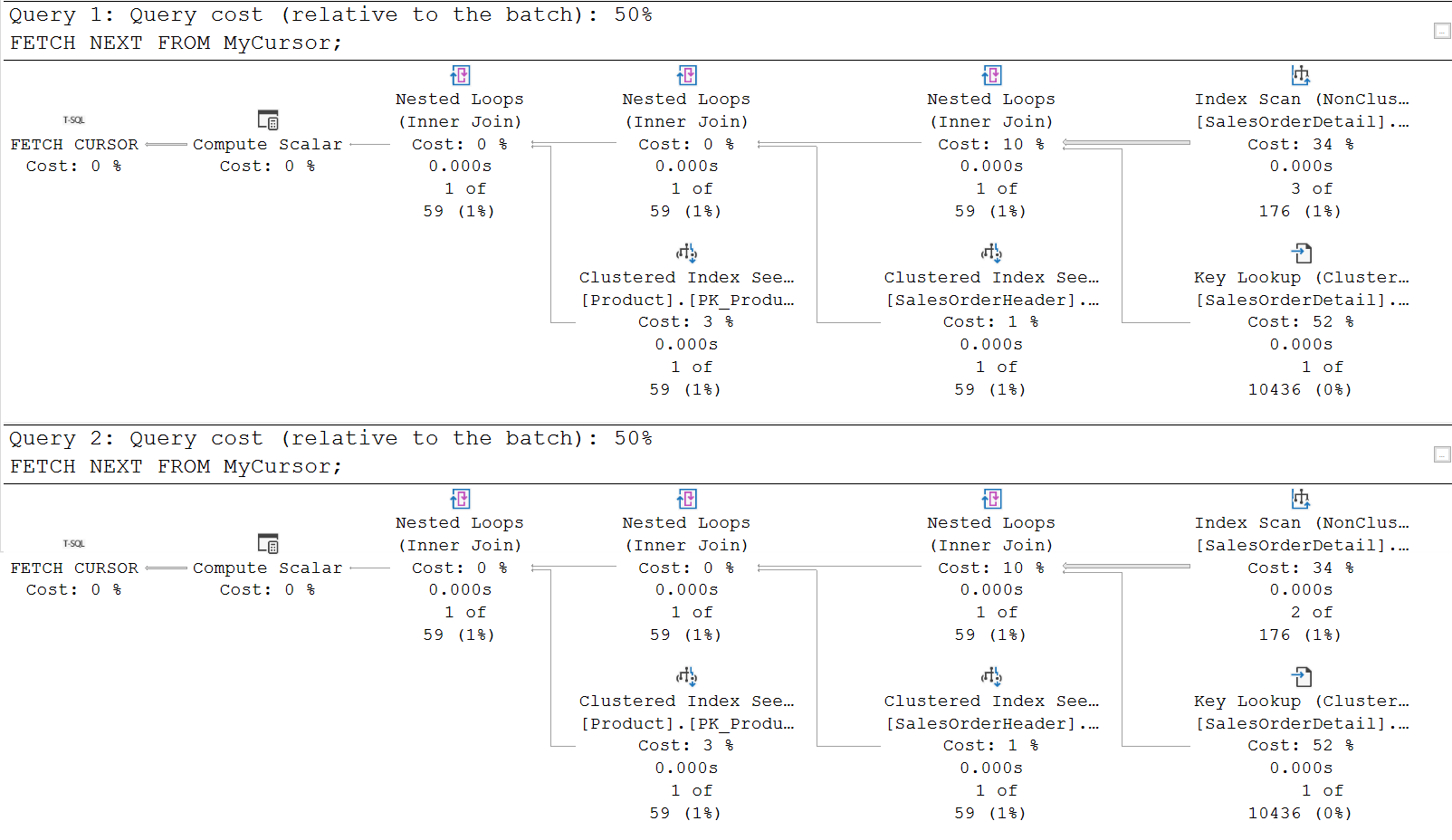 Now, hold it. Don’t start shouting at me that I am wasting space in this blog by posting two identical copies of the same plan. Look closer. Are they really identical? Look specifically at the numbers below the top right Index Scan, that reads SalesOrderDetail, through an index on the ProductID column. Why is the Actual Number of Rows equal to 3 for the first FETCH statement, but only 2 in the second? And, not visible in the screenshot above, if you look at the properties of that Index Scan, you’ll see that the Actual Number of Rows Read differs even more: 5,527 for the first FETCH statement, and only 3,267 for the second. What is the reason for these differences?
