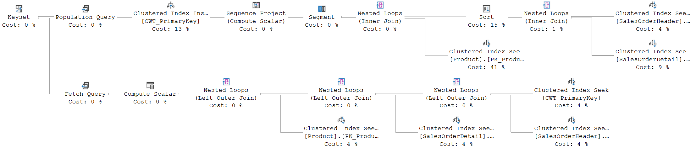 Note that, unlike the static cursor, keyset does allow you to change the read direction from FORWARD_ONLY to SCROLL, so that you can use all of the fetch options (FETCH FIRST, FETCH NEXT, FETCH LAST, FETCH PRIOR, FETCH ABSOLUTE n, and FETCH RELATIVE n) to jump around in the data. This does not affect the execution plans in any way, though. SQL Server simply computes the correct row number to retrieve in the FETCH_RANGE(0) function, which then causes the top left Clustered Index Seek to return the correct row from CWT_PrimaryKey.