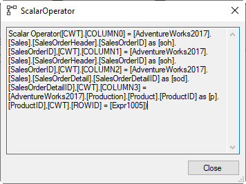 The rest of the execution plan looks, at first sight, very unsurprising. A Nested Loops operator into a Clustered Index Seek on SalesOrderHeader, to retrieve the SalesOrderID and OrderDate columns, based on COLUMN0 (the SalesOrderID from the Fetch Query). It might seem a bit superfluous to return SalesOrderID here – after all, it has by definition the same value as COLUMN0. But since the SELECT list of our query includes this column, it is returned. There is no gain in using COLUMN0 instead.