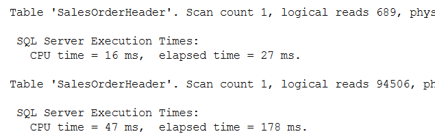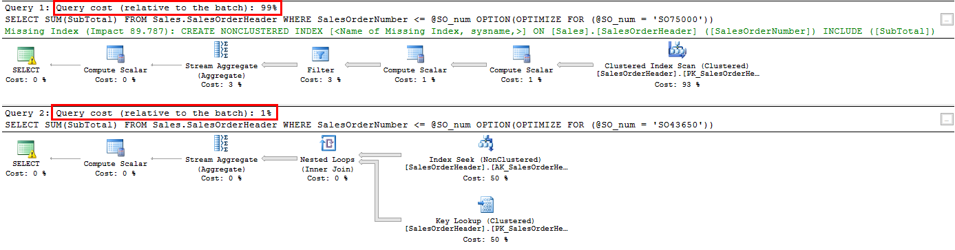 DECLARE @SO_num nvarchar(23) = 'SO78971'; SET STATISTICS IO, TIME ON; SELECT SUM(SubTotal) FROM Sales.SalesOrderHeader WHERE SalesOrderNumber <= @SO_num OPTION(OPTIMIZE FOR (@SO_num = 'SO75000')); SELECT SUM(SubTotal) FROM Sales.SalesOrderHeader WHERE SalesOrderNumber <= @SO_num OPTION(OPTIMIZE FOR (@SO_num = 'SO43650'));