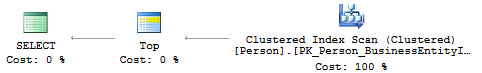 When reading the execution plan below and starting at the right (the Clustered Index Scan), it may appear as if this will read all rows in the table, generating a lot of I/O, and then pass all these rows to the Top operator. But that is not how it actually works. As described above, every operator is programmed to produce and return a single row when called by its GetNext() method. That means that, until the GetNext() method of the Clustered Index Scan is called, it will do nothing. The calls to this method come from the other end of the data flow – the Top operator. Which, in turn, is called by the Result operator (called SELECT). So following the order of execution instead of the flow of data, SELECT calls Top, which calls Clustered Index Scan. Clustered Index Scan reads and returns a row, which Top then receives and passes on to SELECT. SELECT receives that row, returns it to the client, and then calls Top again, requesting a second row. But Top is instructed (in its properties) to only return a single row, so instead of calling Clustered Index Scan, it will return an “end of data” marker to the SELECT operator.